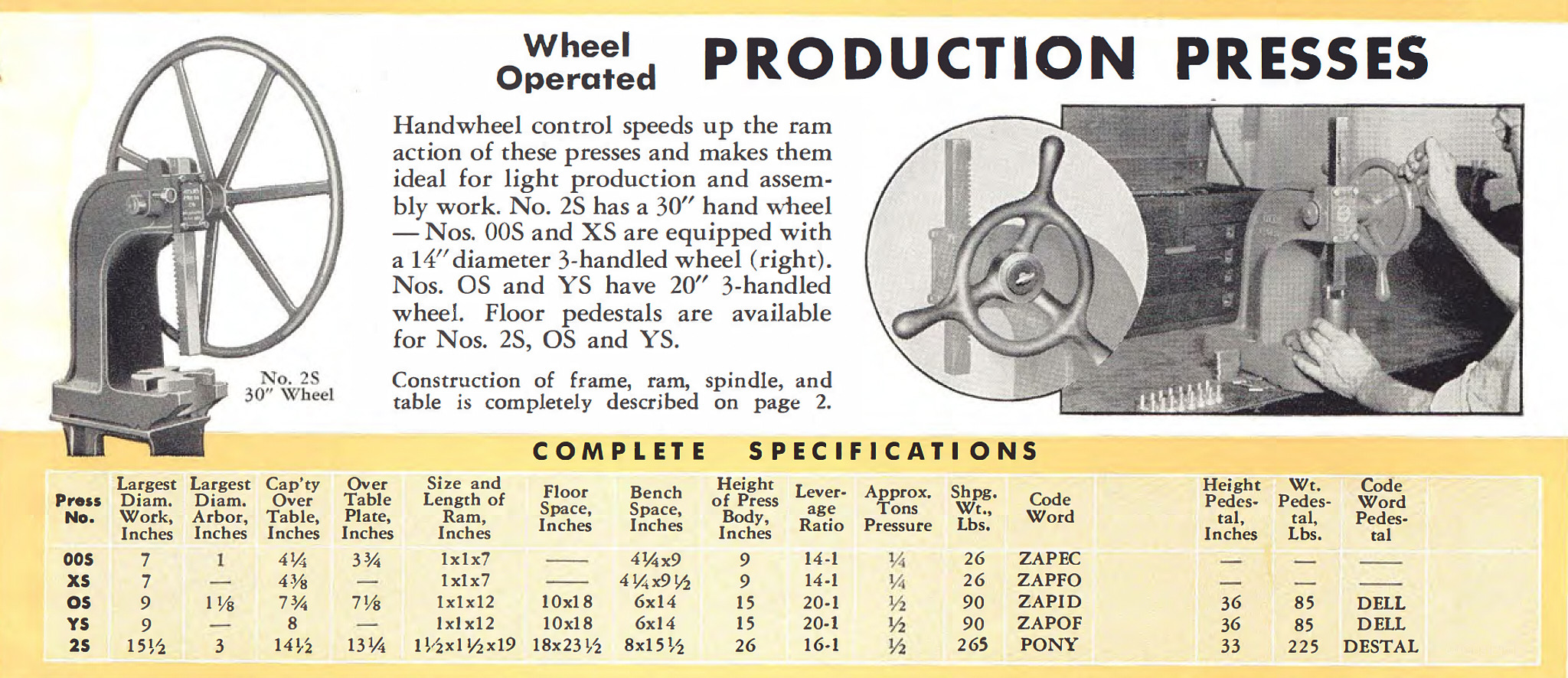 An old Atlas press, probably from around war time, mid 1940s? What seems to be very original, peeling gray paint and in very good working order. See the catalog images below from the Atlas 1943 catalog.