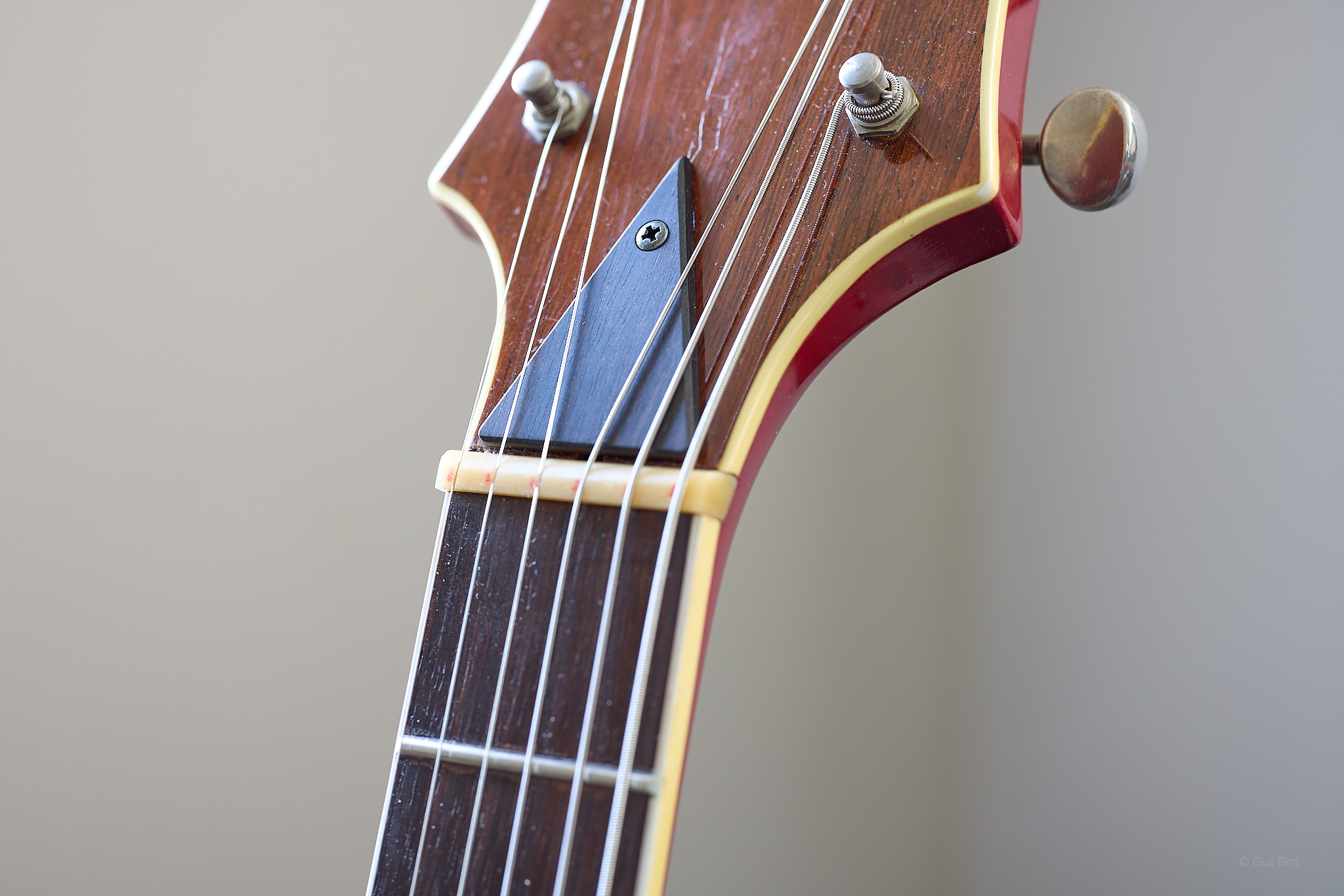 An electric Martin guitar, in great shape with a free truss rod nut but excessive back bow in the neck. Martin supposedly made 750 GT-75s (double cutaway) and 453 GT-70s (single cutaway) and 750 GT-75s, from 1966 to October 1968 (the two years they were in production). These guitars came in black, a maroon/burgundy and the red seen on this example. Also rumored is one left-handed single cutaway GT-70 in red, which I guess might have been a one-off prototype. These GT models evolved from Martin's F series, with special DeArmond pickups, F-holes and a laminated maple body. They were also the first Martins to use an adjustable truss rod (see below). This one appears to be an early 1966 from the serial number.